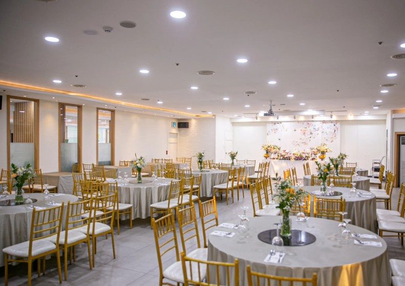 연회장 분위기는 세련되면서도 아늑해서 가족 행사에 딱 맞는 분위기를 만들어줍니다.